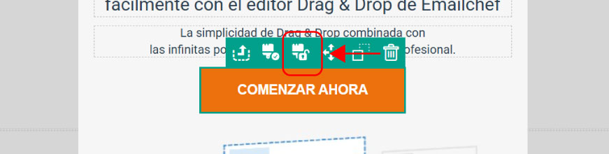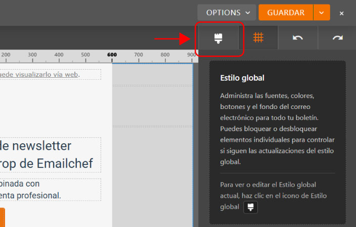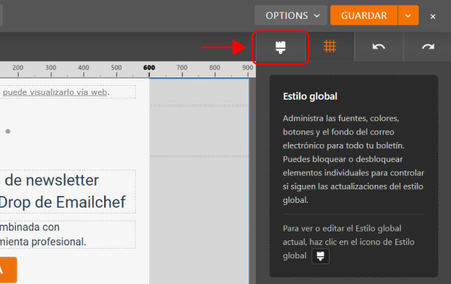 Para acceder a los estilos globales, abre el editor drag & drop de Emailchef y haz clic en el icono del pincel situado en la parte superior de la columna derecha.