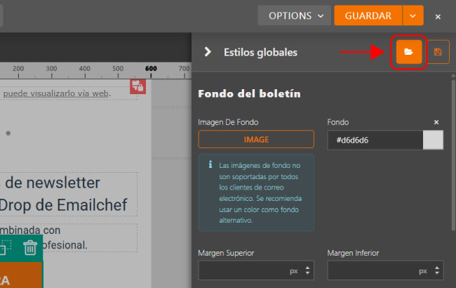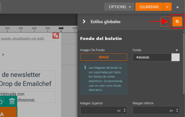 Una vez que hayas definido el aspecto ideal de tu newsletter, puedes guardar la configuración y recuperarla en cualquier campaña futura, sin tener que configurar manualmente las fuentes, los colores y los márgenes cada vez.