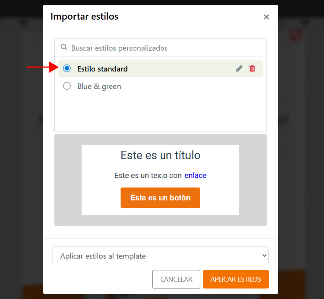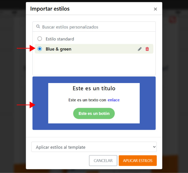 Una vez elegida la opción, haz clic en Aplicar estilos para confirmar. El estilo se importará en la configuración de estilos globales de tu newsletter actual.
