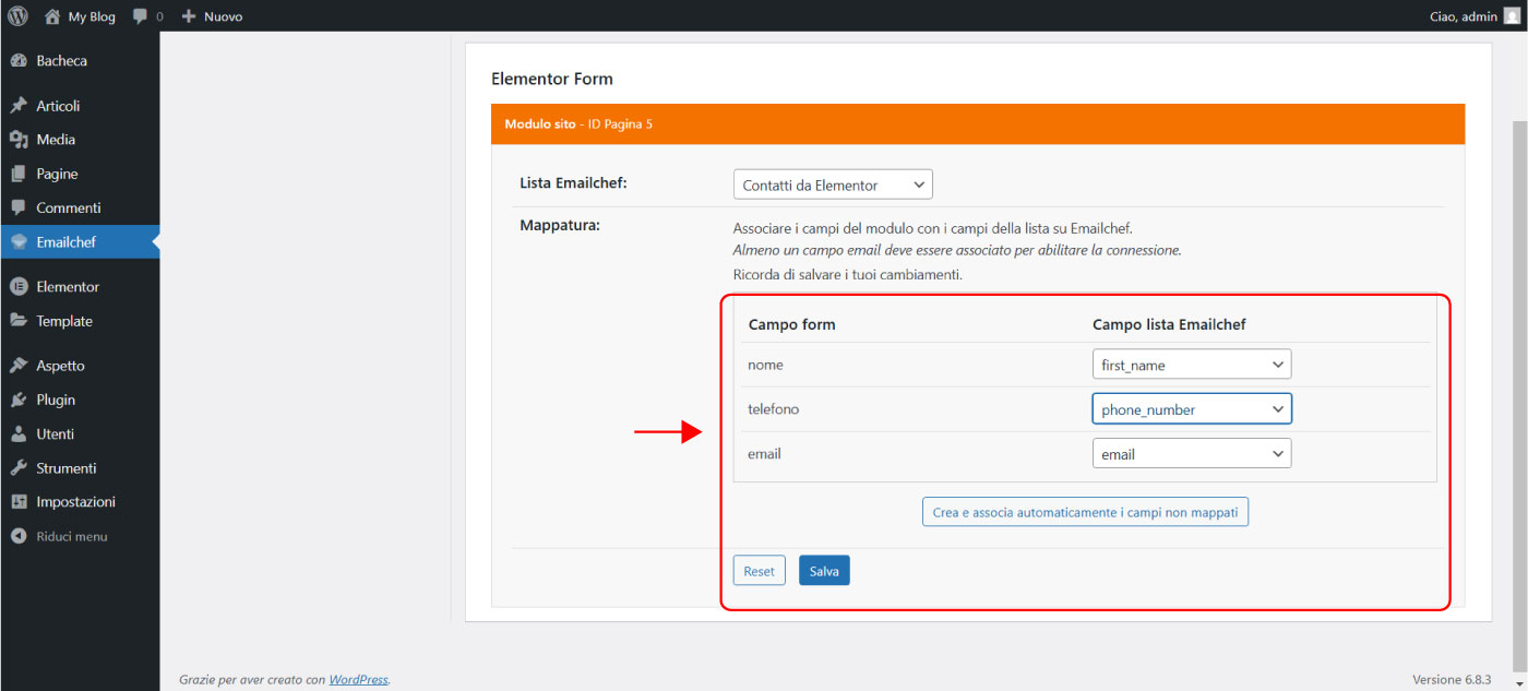 Asocia los campos de tu formulario (nombre, correo electrónico, teléfono, etc.) con los campos correspondientes en tu lista de Emailchef.