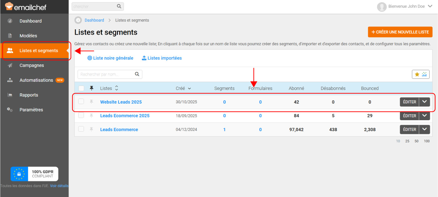 - Sélectionnez la liste que vous souhaitez segmenter.