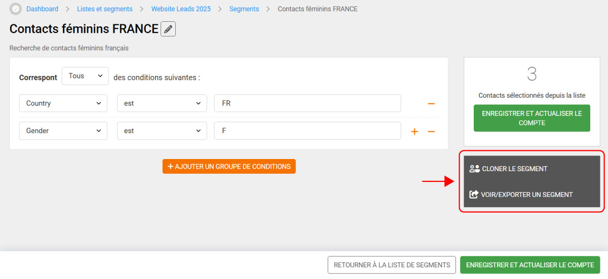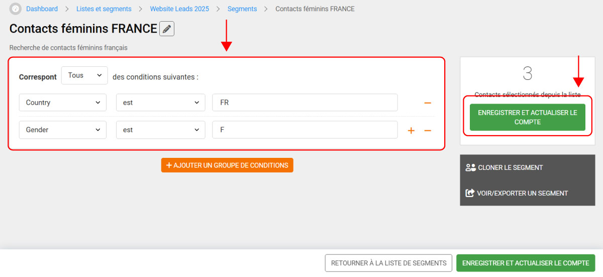 Une fois vos conditions définies, les segments se mettent à jour automatiquement. Ils seront donc toujours prêts pour vos campagnes et automatisations, sans besoin de les modifier manuellement.