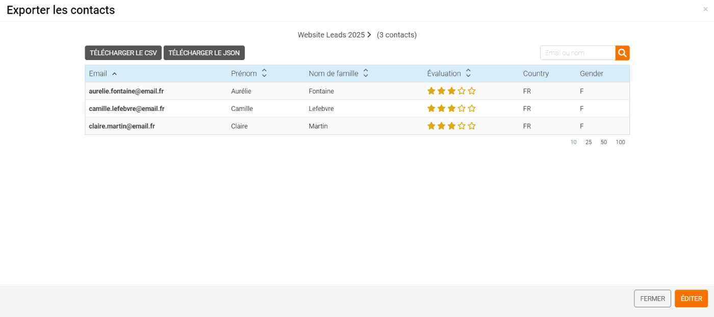 Le segment obtenu peut également être visualisé et exporté au format JSON ou CSV, ou encore dupliqué et enregistré depuis la même page des segments.