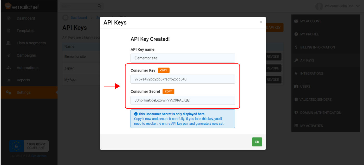 Log in to your Emailchef account and create a new contact list where subscribers from Elementor will be added automatically.