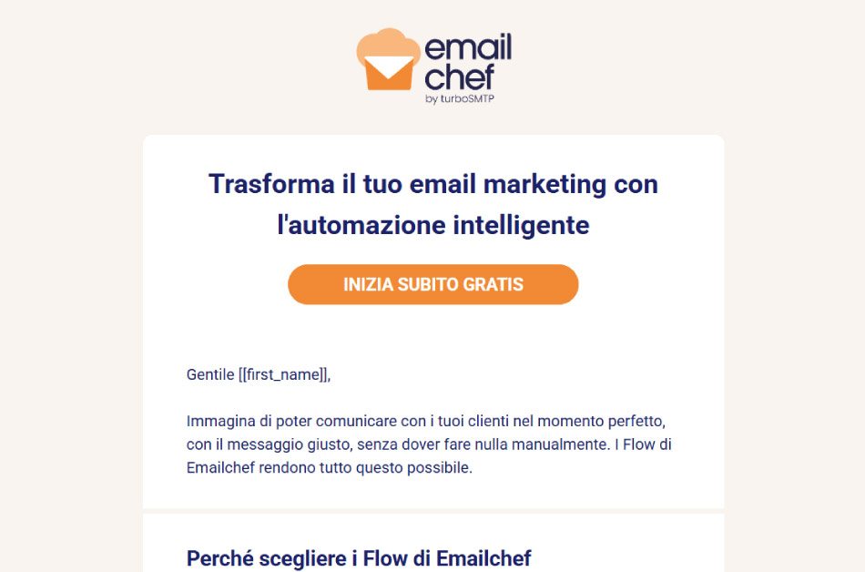 L’email si rivolge al destinatario per nome grazie al segnaposto [[first_name]], che Emailchef sostituisce automaticamente con il nome reale di ciascun cliente al momento dell’invio.