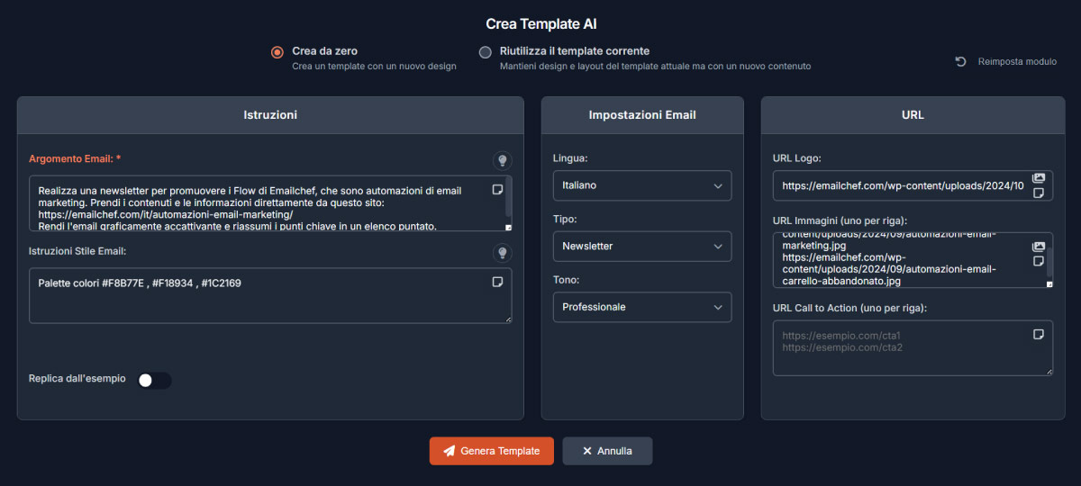 Invece di scrivere i contenuti da zero, abbiamo usato una delle funzioni più utili di Pagino: la lettura automatica di una pagina web. Basta incollare l’URL e Pagino estrae da solo le informazioni rilevanti, le sintetizza e le trasforma in un template email HTML personalizzato, pronto all’invio.
