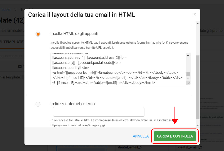 Incollo il codice HTML nel box Incolla HTML dagli appunti poi clicco su Carica e controlla.