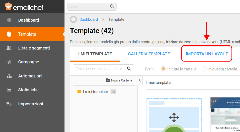 Una volta effettuato il login, seleziono Template, poi Importa un layout.