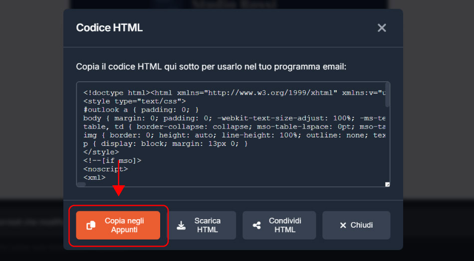 Ovviamente posso modificare ogni elemento dell’email e, una volta soddisfatti del risultato, posso copiarla in formato HTML per incollarla direttamente in Emailchef. Per farlo clicco su HTML.