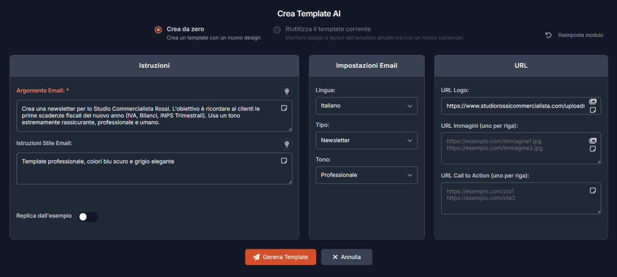 In questo articolo lo vediamo in pratica con due esempi concreti: un commercialista che deve comunicare le scadenze fiscali senza allarmare i clienti, e un’azienda che vuole promuovere una funzionalità ai propri utenti trasformando una pagina del sito in una newsletter. In entrambi i casi vedrai anche il template email HTML generato, pronto da importare nella tua piattaforma di invio.