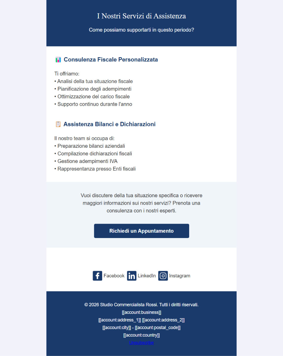 Più sotto, una sezione dedicata ai servizi di assistenza ricorda al cliente cosa può fare lo studio per lui in questo periodo, e un pulsante di call to action invita a richiedere un appuntamento. Chiude il footer con i contatti e la firma del professionista.