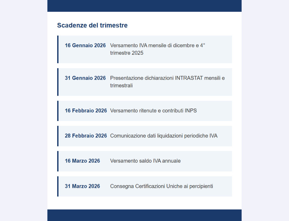 Segue poi l’elenco delle scadenze del trimestre, presentate in modo chiaro e senza gergo tecnico eccessivo.