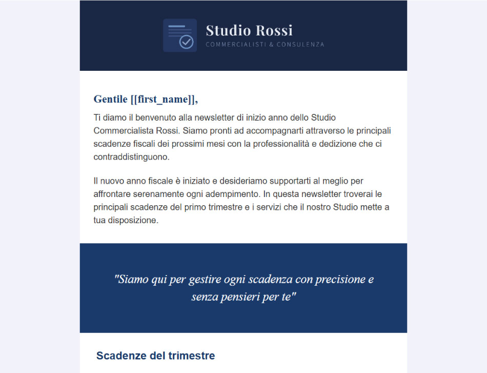 “Crea una newsletter per lo Studio Commercialista Rossi. L’obiettivo è ricordare ai clienti le prime scadenze fiscali del nuovo anno (IVA, Bilanci, INPS Trimestrali). Usa un tono estremamente rassicurante, professionale e umano.”