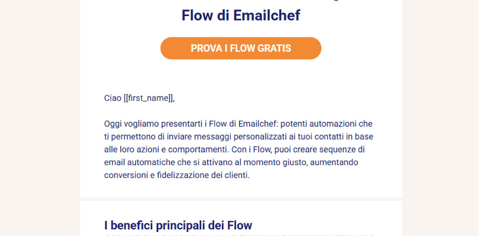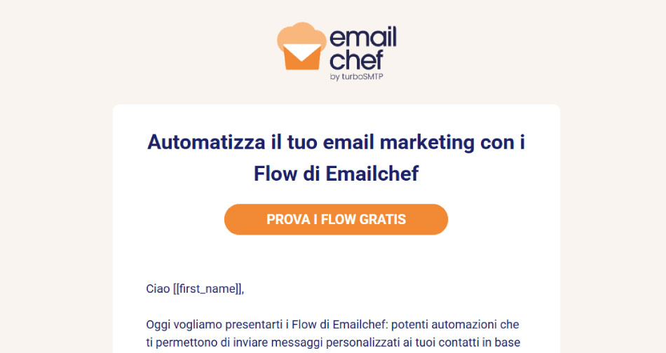 “Realizza una newsletter per promuovere i Flow di Emailchef, che sono automazioni di email marketing. Prendi i contenuti e le informazioni direttamente da questo sito: https://emailchef.com/it/automazioni-email-marketing/