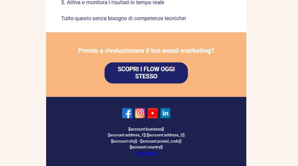 Il risultato è stato una newsletter moderna e ben strutturata. In apertura, logo e un titolo d’impatto seguiti da una prima call to action per invitare a provare i Flow.