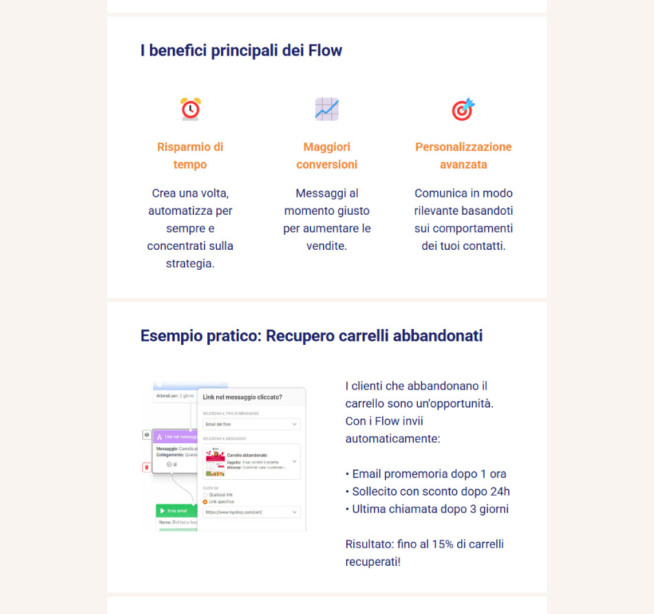 Al centro dell’email, tre punti chiave sui benefici, un esempio pratico di automazione tra le più usate e una spiegazione per punti di come funzionano i Flow.