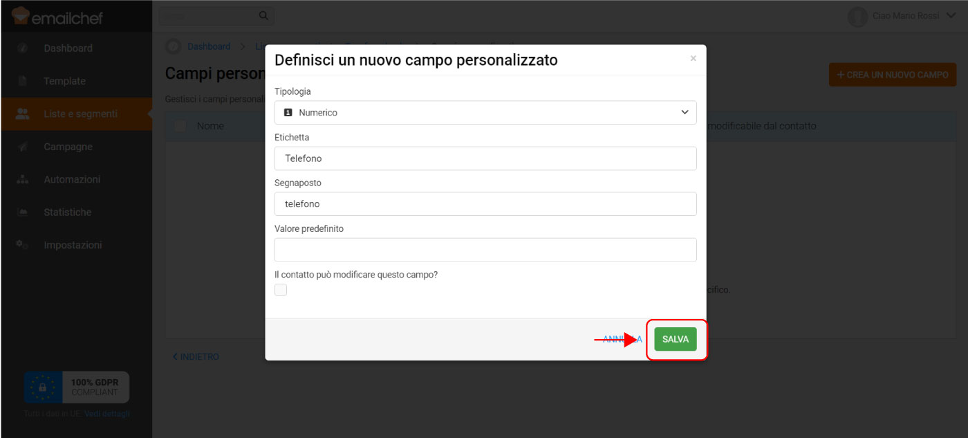 Se nel tuo form hai inserito campi personalizzati come Telefono, Settore o Nazione, ti consigliamo di ricrearli anche in Emailchef.