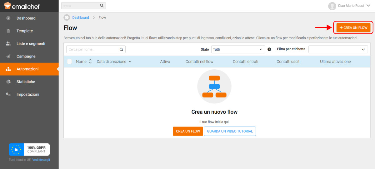 Ora puoi impostare l’automazione per la richiesta di recensioni in pochi minuti nella sezione Automazioni. Seleziona poi CREA UN FLOW.