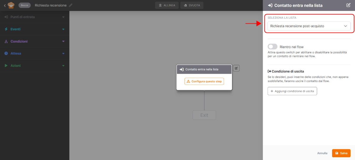 Come punto di entrata scegli Contatto entra nella lista e seleziona la lista che hai appena creato.