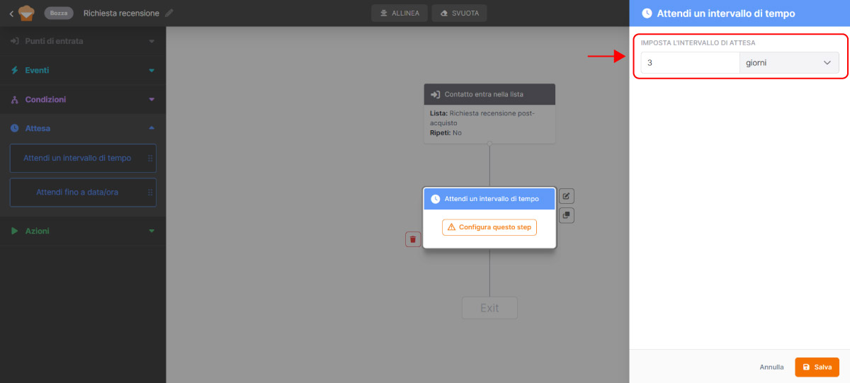 Aggiungi un blocco Attesa > Attendi un intervallo di tempo e imposta i giorni che vuoi far trascorrere prima dell’invio. In questo caso, lascio passare 3 giorni.