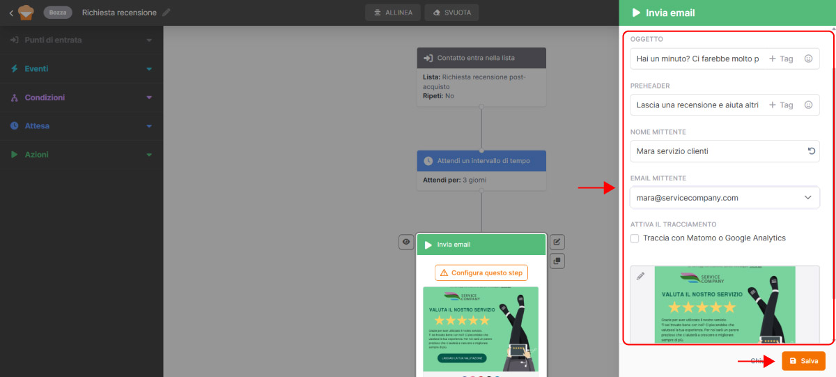 Tra le azioni, seleziona il blocco Invia email e configura l’email per la richiesta di recensioni. Quando sei soddisfatto, clicca su Salva.