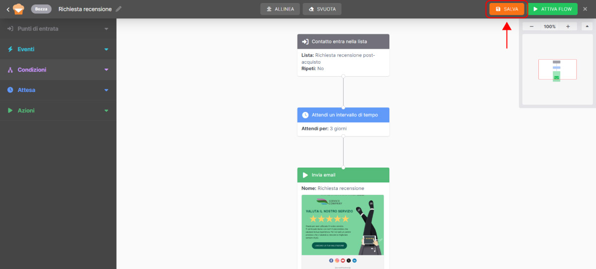 Da quel momento, ogni volta che un cliente viene aggiunto alla lista “Richiesta recensione post-acquisto”, il flusso si attiverà automaticamente e invierà l’email al momento giusto, senza che tu debba fare altro.