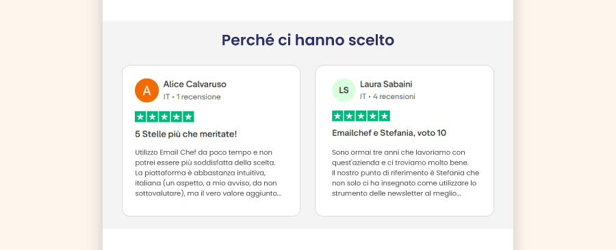 • Nelle email: posizionala subito prima della call to action, non dopo. Chi ha già letto la recensione arriva al pulsante con le difese abbassate, chi la trova dopo ha già deciso.