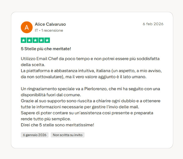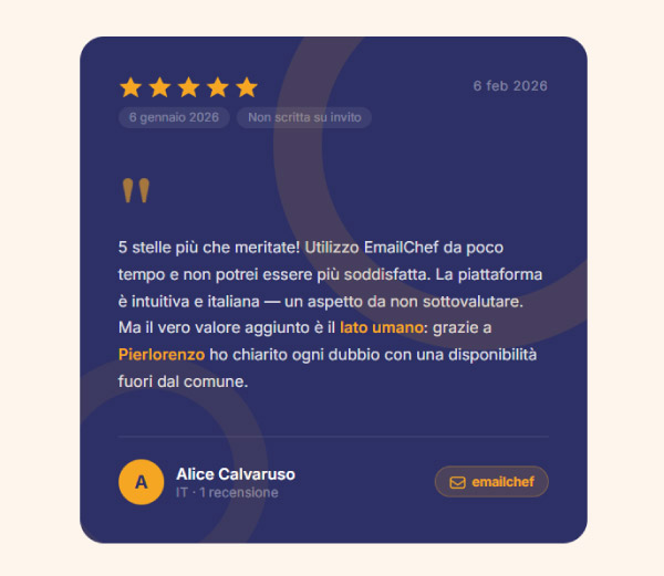 Prova Emailchef gratis per 30 giorni e inizia oggi a raccogliere recensioni online in modo sistematico: importa i tuoi contatti, crea la tua welcome series e configura il flusso automatico. Nessuna carta di credito richiesta.