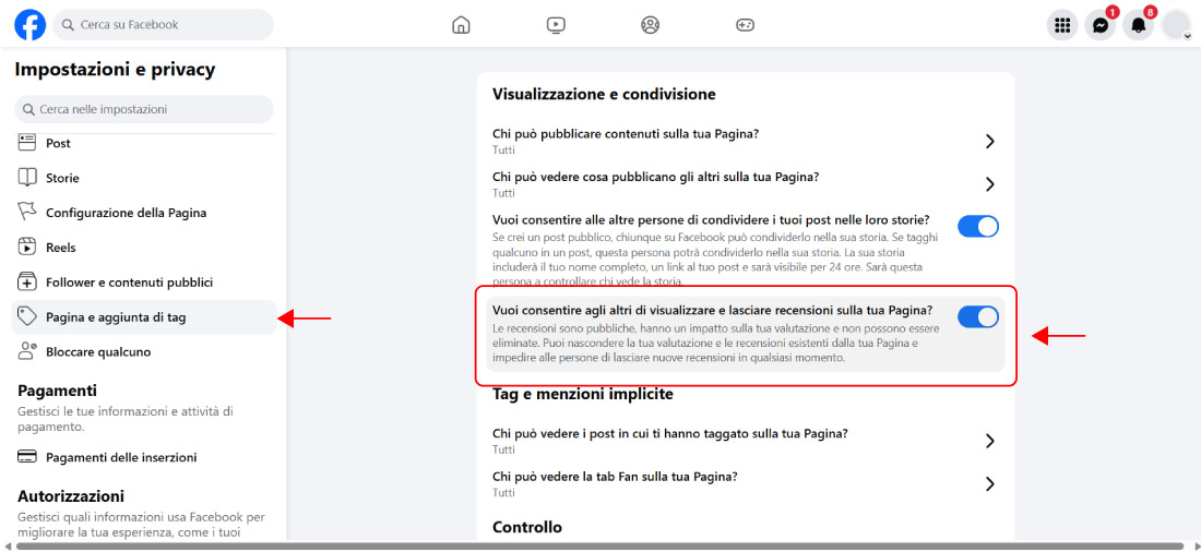 Cerca la sezione Pagina e aggiunta di tag dal menù a destra e attiva l’opzione che consente agli altri di lasciare recensioni.