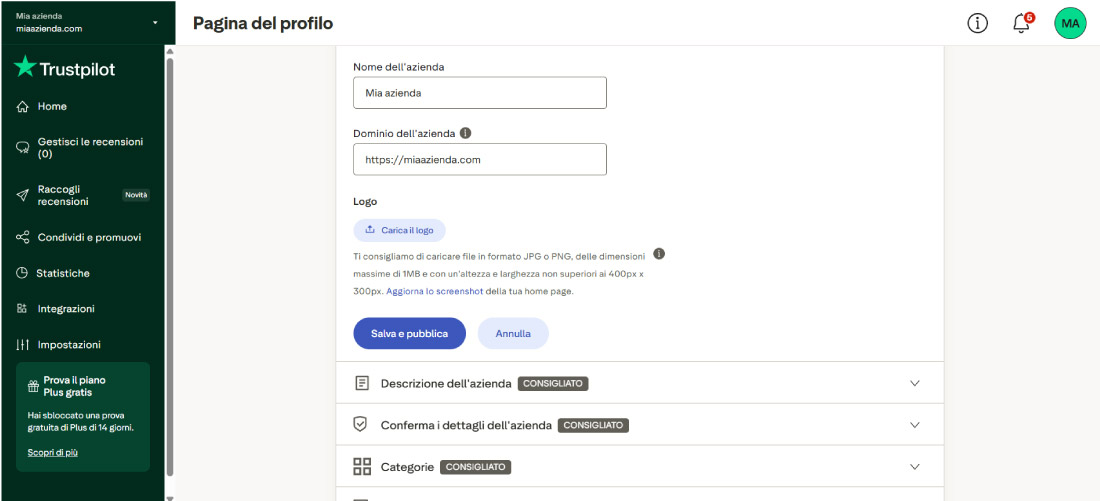 Una volta registrato, completa il profilo aziendale con nome, logo, descrizione e informazioni di contatto: più è completo, più ispira fiducia.