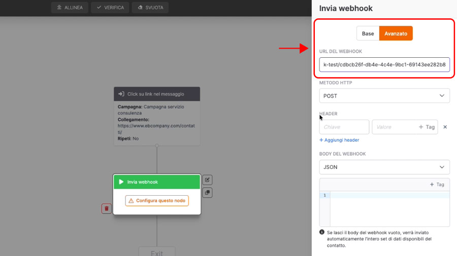 Sulla destra, seleziona Avanzato e incolla alla voce URL del webhook l’URL che hai copiato prima in n8n.