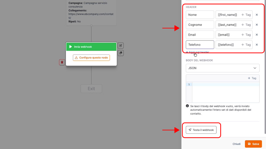 Negli header aggiungi i campi dei dati che ti interessa trasmettere a n8n. In questo caso seleziono: Nome, Cognome, Email e Telefono.