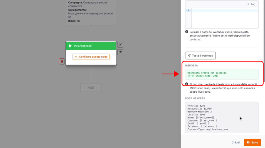 In questo caso il test è andato a buon fine. In caso contrario torna su n8n e clicca nuovamente su Listen for test event. Poi ripeti nuovamente il test su Emailchef.