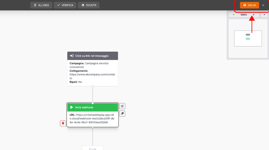 In breve, significa che puoi creare un’automazione direttamente in Emailchef (ad esempio “quando un iscritto clicca su questo link specifico in una campagna”) e come azione scegliere “Invia Webhook”.