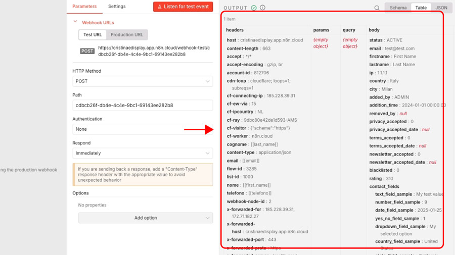 Tornando su n8n, trovi i dati di test ricevuti da Emailchef sulla destra.