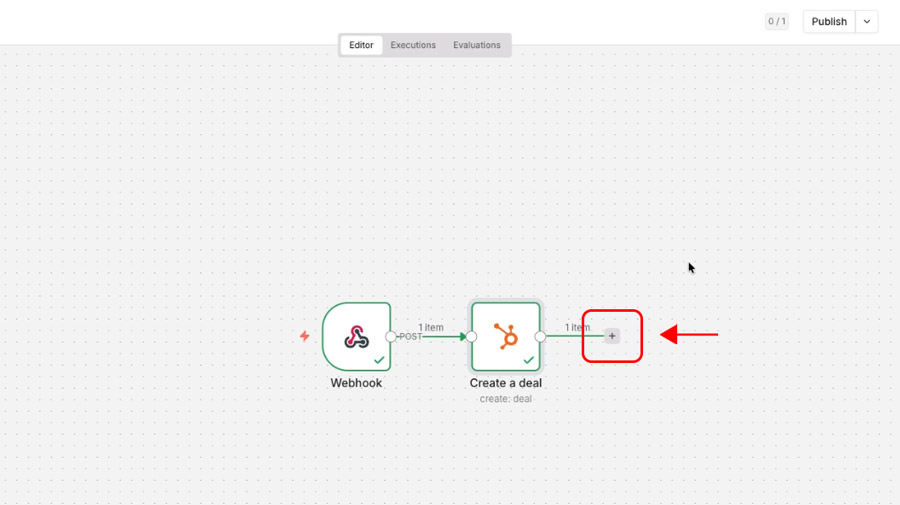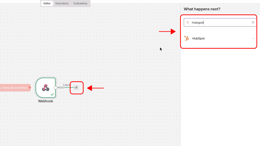 Ti basterà cliccare sul + per aggiungere un nuovo nodo e cercare HubSpot.