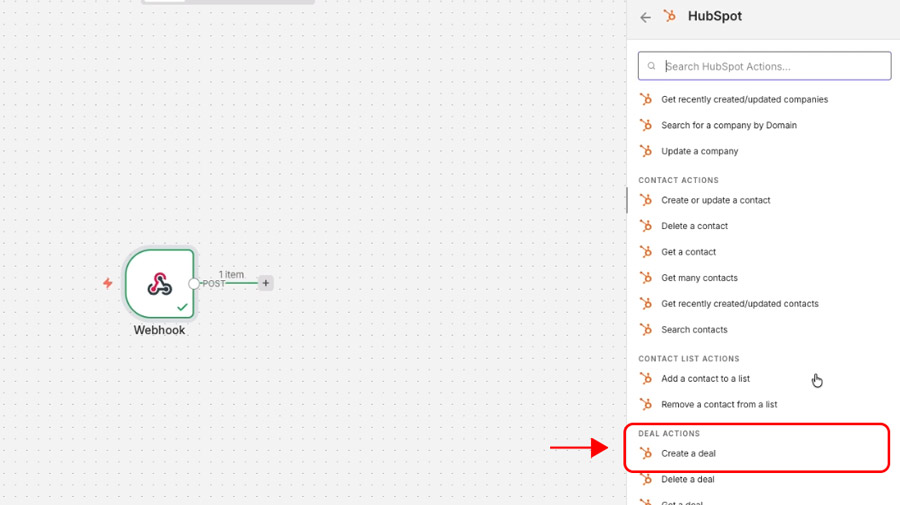 Come azione scegli Create a deal, ovvero crea una trattativa.