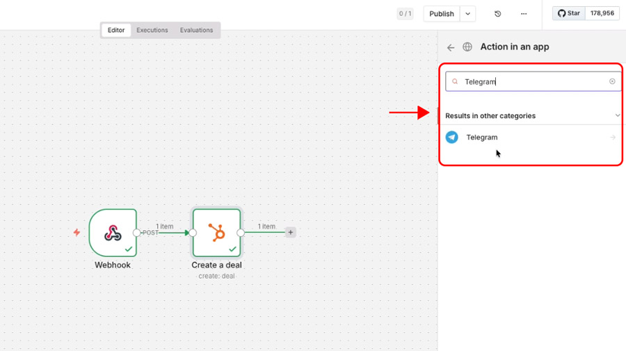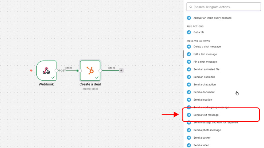 I CRM hanno le notifiche email ma c’è un modo più veloce e diretto per avvisare i venditori. Quindi aggiungiamo un ultimo nodo: Telegram.