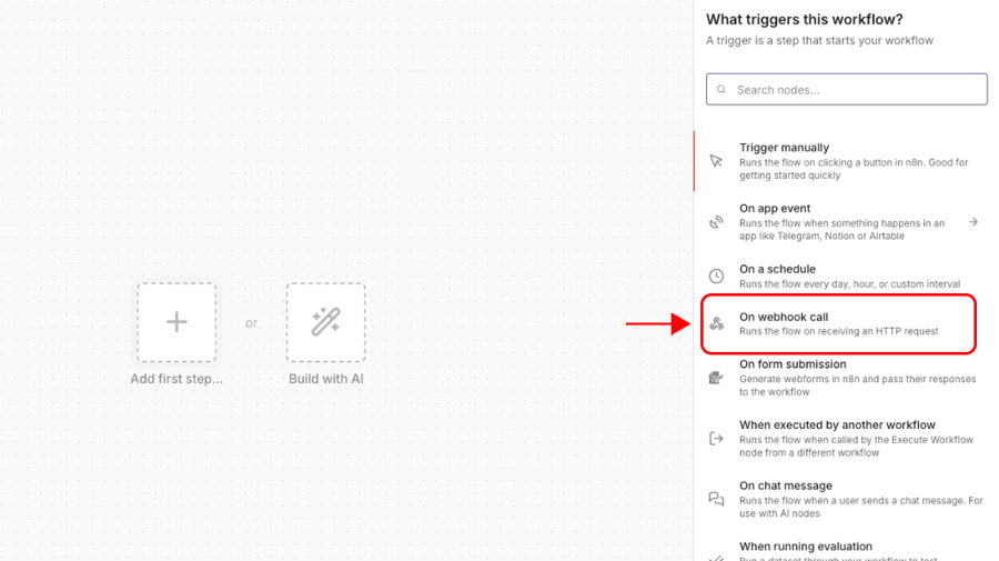 Aggiungi come trigger di partenza un webhook. Per farlo clicca su Add first step.