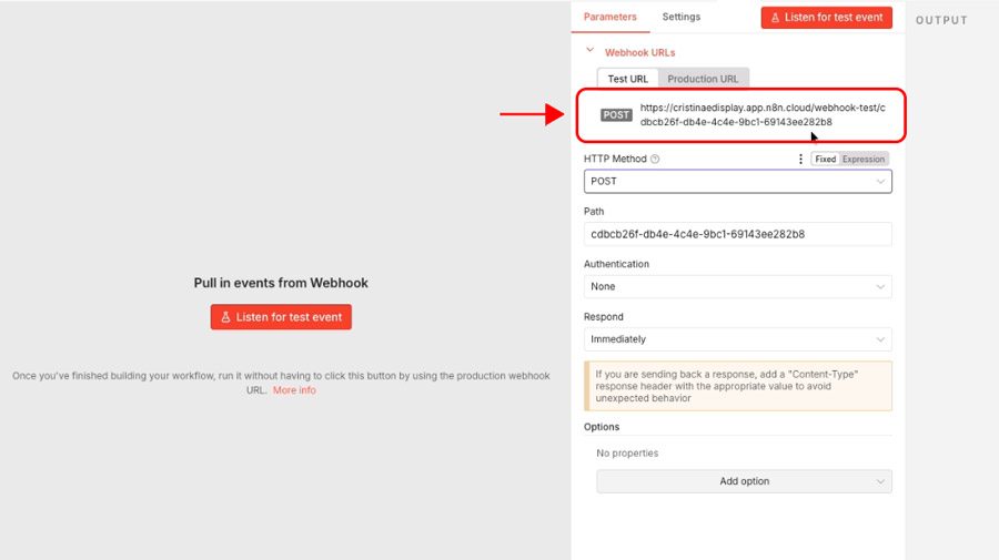 Sotto la voce Test URL c’è l’indirizzo del tuo webhook: copialo.