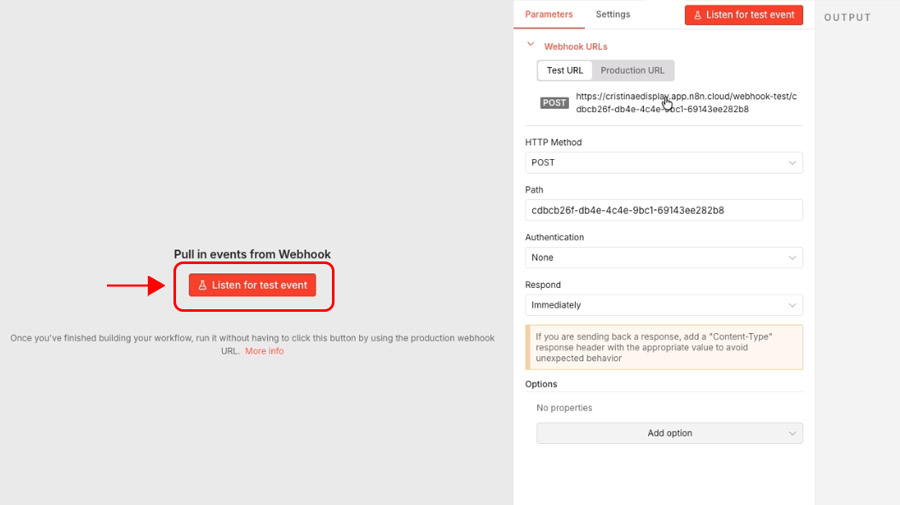 Clicca su Listen for test event: Ora n8n è pronto a ricevere i dati.