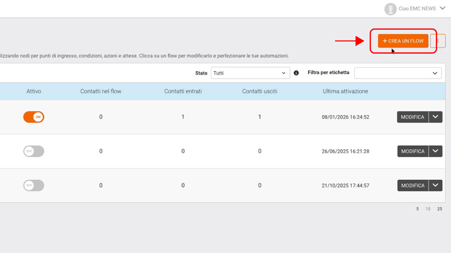 Oltre ai webhook, Emailchef offre un sistema completo di automazioni email, chiamato Emailchef Flow, con cui puoi costruire: