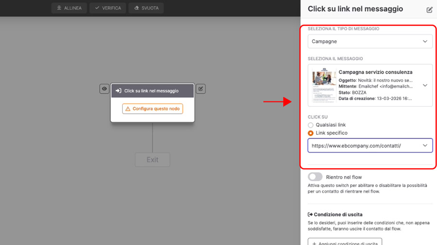 Sulla destra seleziona la campagna che hai creato, poi scegli Link specifico e seleziona il link della call to action. Infine clicca Salva.