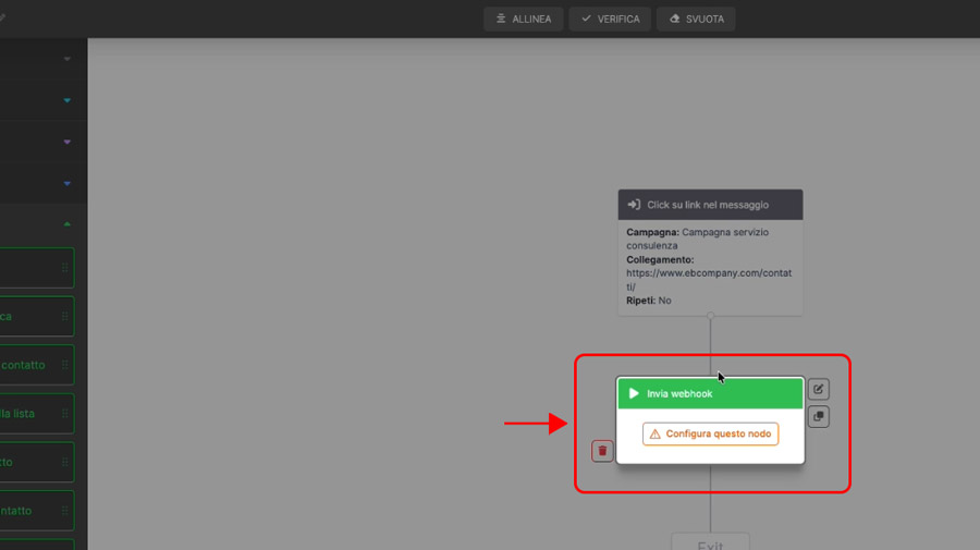 Ora, tra le azioni, scegli Invia webhook e trascinalo sotto al primo nodo.