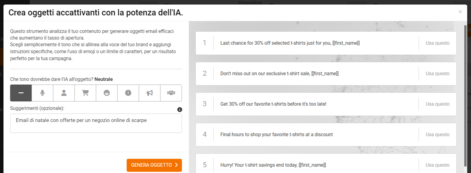 Per questo, da oggi puoi utilizzare l’intelligenza artificiale di Emailchef per generare automaticamente l’oggetto e il preheader delle tue email.