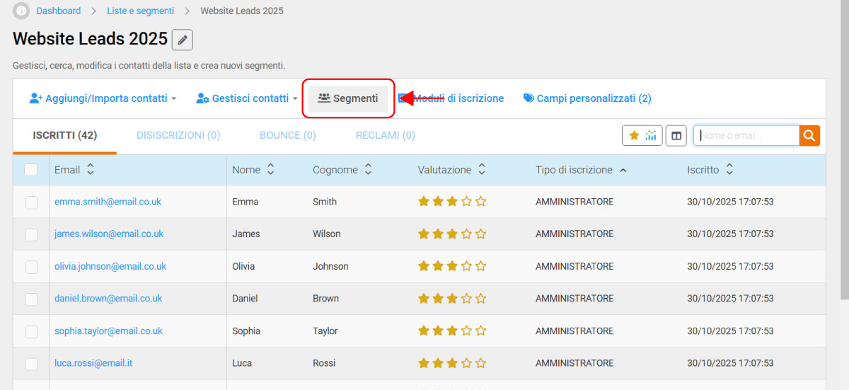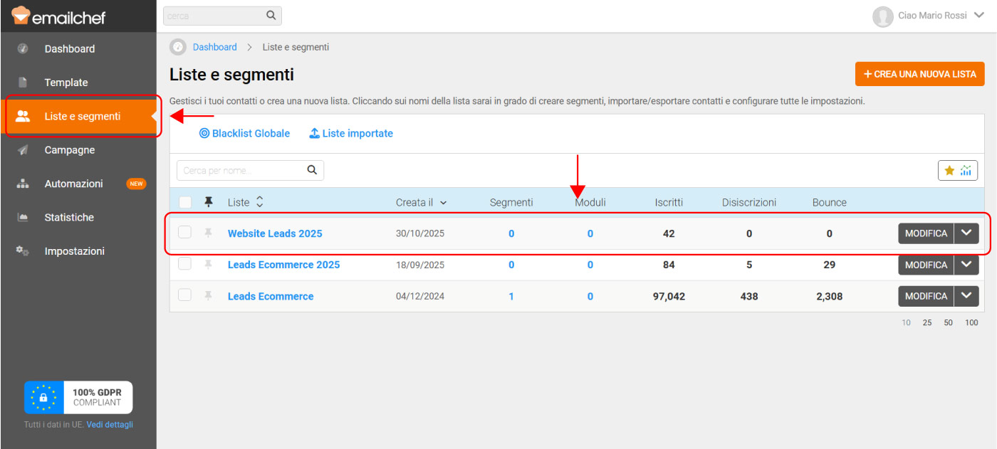 - Vai su Liste e Segmenti dal menu a sinistra.