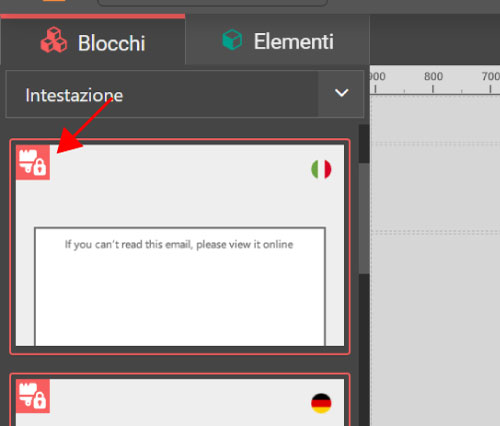 Nella galleria dei blocchi alcuni Blocchi speciali non seguono automaticamente gli Stili globali. Questi blocchi sono riconoscibili da un’icona con pennello e lucchetto.