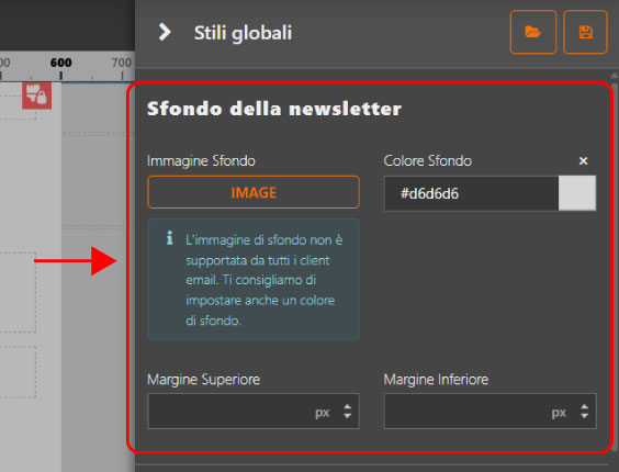 Si aprirà il pannello di configurazione, da cui potrai gestire tutte le impostazioni grafiche dell’email.