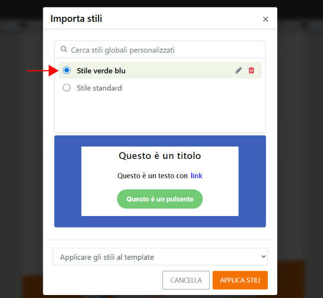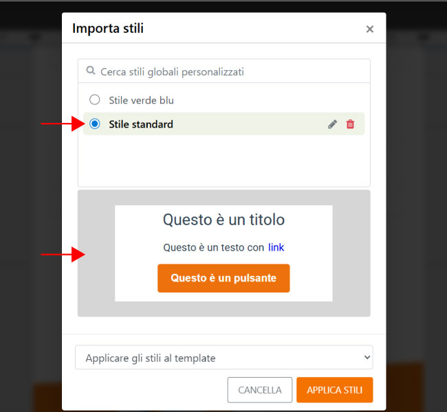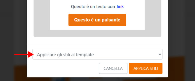 - Applicare gli stili al template: aggiorna tutto il template corrente adottando lo stile salvato.