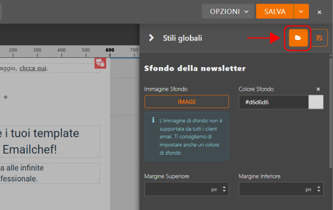 Una volta definito l’aspetto ideale della tua newsletter, puoi salvare la configurazione e richiamarla in qualsiasi altra campagna futura, senza dover impostare manualmente font, colori e margini ogni volta.